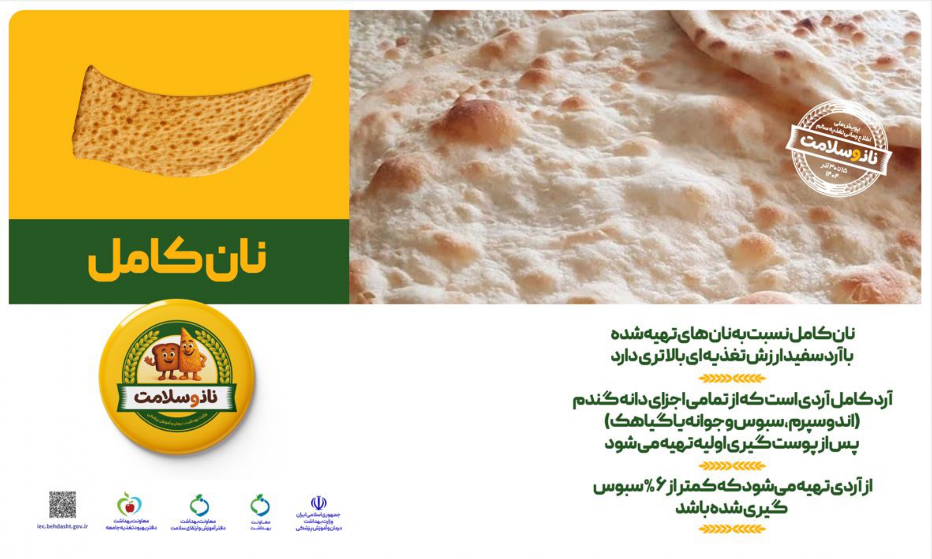 پویش ملی اطلاع رسانی تغذیه سالم به پیشنهاد دفتر بهبود تغذیه جامعه وزارت بهداشت درمان و آموزش پزشکی از تاریخ پانزدهم تا سی ام آذر ماه در حال اجرا بوده و با هدف کاهش بار بیماریها با افزایش آگاهی مردم، در سال جاری نان کامل را در مرکز توجه قرار داده و در صدد است تا مزایای آن را به نحو مطلوب و مؤثر به اطلاع آحاد جامعه برساند.