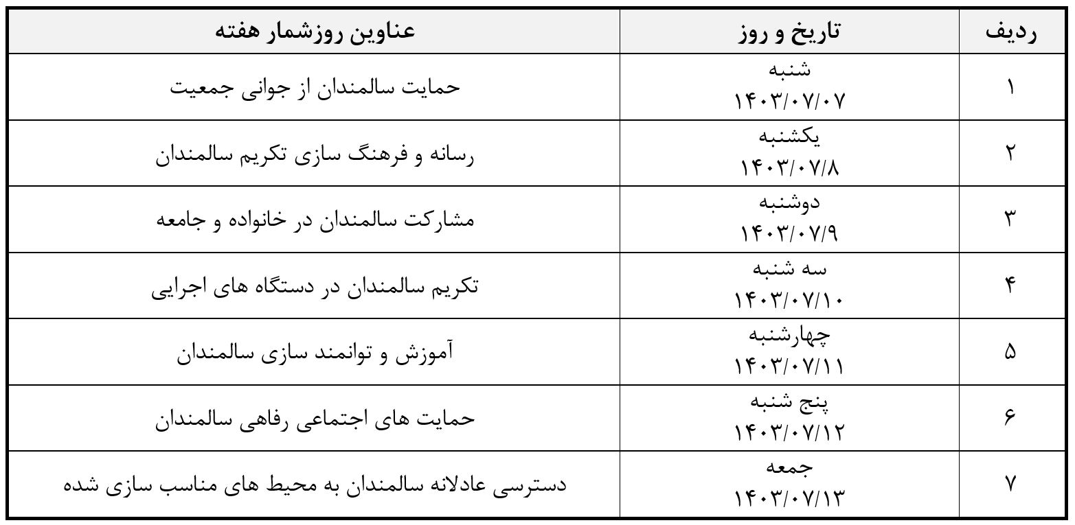 قدیر گندم کار اخبار 09 مهر 1403 بازدید: 112 امتیاز: ( 1 Rating ) هفته سالمندان گرامی باد. امتیاز کاربران لطفا رای دهید رای 1 رای 2 رای 3 رای 4 رای 5 روز جهانی سالمند (اول اکتبر) و هفته سالمند را گرامی می داریم. شعار ملی روز جهانی سالمندان سال1403: " سالمندی فعال، فردایی برای همه" و روزشمار هفته سالمند قبلی بعدی