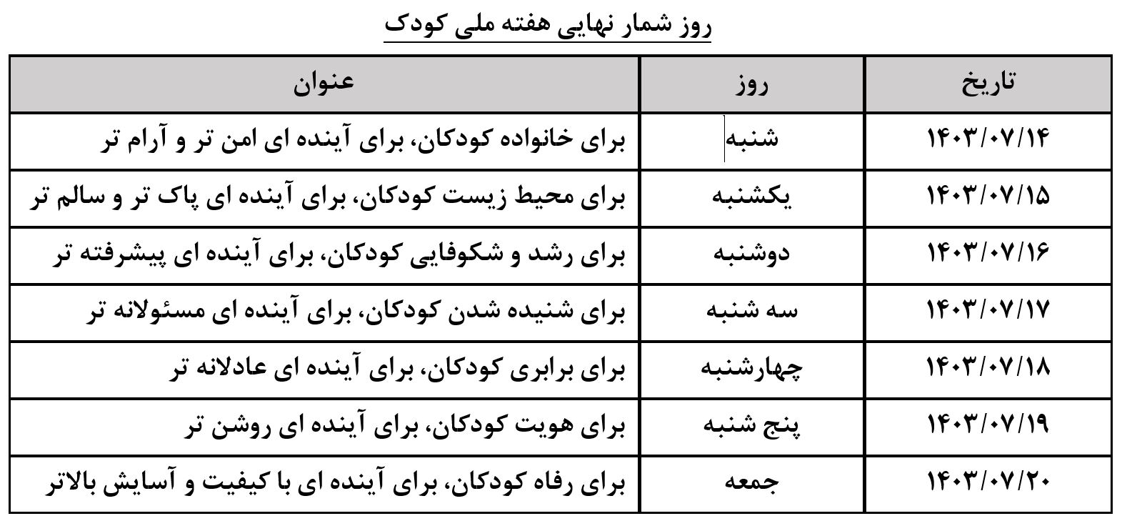 با توجه به فرارسیدن هفته ملی کودک ( 14/7/1403 تا 20/7/1403) و شعار امسال هفته کودک با عنوان "برای کودکان، برای آینده"