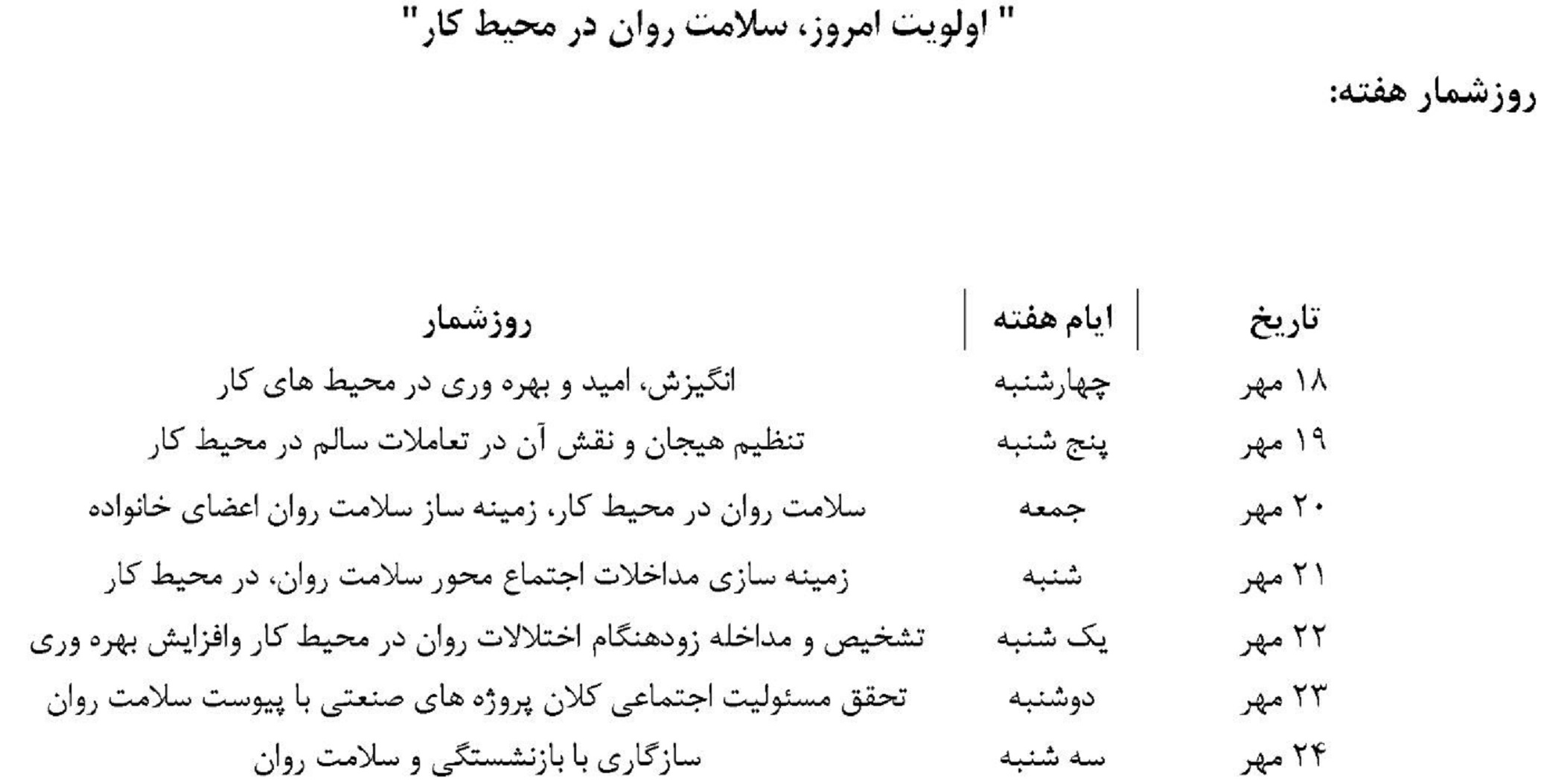 قدیر گندم کار اخبار 18 مهر 1403 بازدید: 97 امتیاز: ( 0 Rating ) هفته سلامت روان را گرامی می داریم امتیاز کاربران لطفا رای دهید رای 1 رای 2 رای 3 رای 4 رای 5 دهم اکتبر (مصادف با امروز؛ چهارشنبه هجدهم مهرماه 1403)، روز جهانی سلامت روان و هفته سلامت روان (18 تا 24 مهر) را گرامی می داریم. قبلی بعدی
