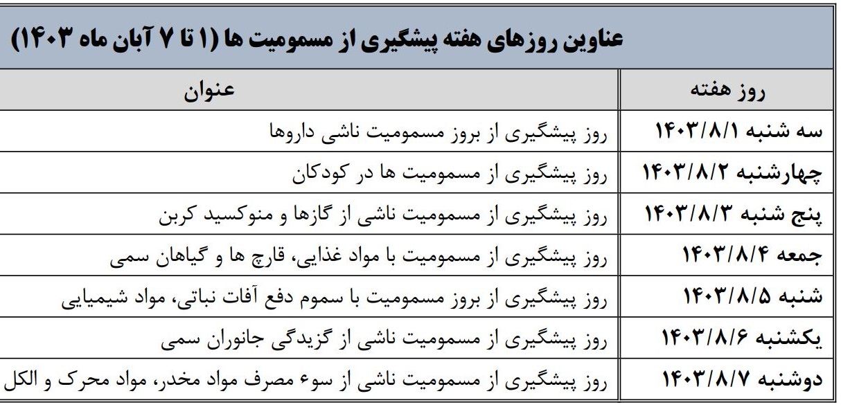 هفته اول آبان ماه سال جاری (اول تا هفتم آبان) «هفته پیشگیری از مسمومیتها» نام گزاری شده است