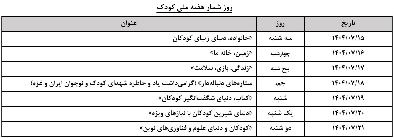 روز شمار این هفه بدین شرح اعلام گردیده است.