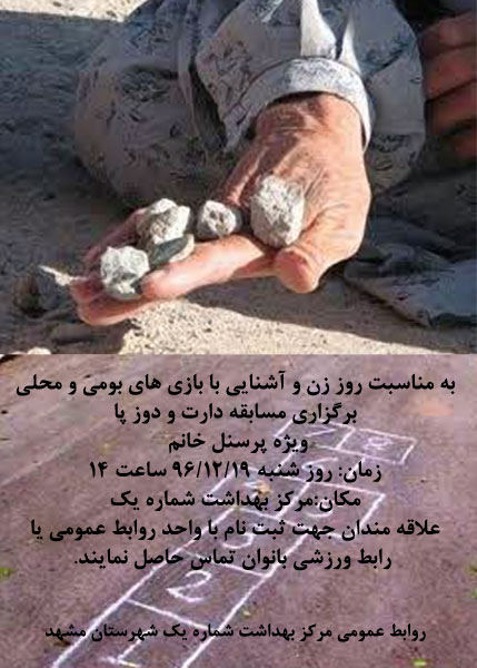 به اطلاع کلیه همکاران خانم می رساند به مناسبت روز زن و آشنایی با مسابقات بومی محلی روز شنبه ساعت 14 مسابقات دارت و دوز پا در مرکز بهداشت شماره یک برگزار می گردد.از علاقه مندان دعوت به عمل می آید جهت ثبت نام با واحد روابط عمومی یا رابط ورزشی بانوان تماس حاصل نمایند.